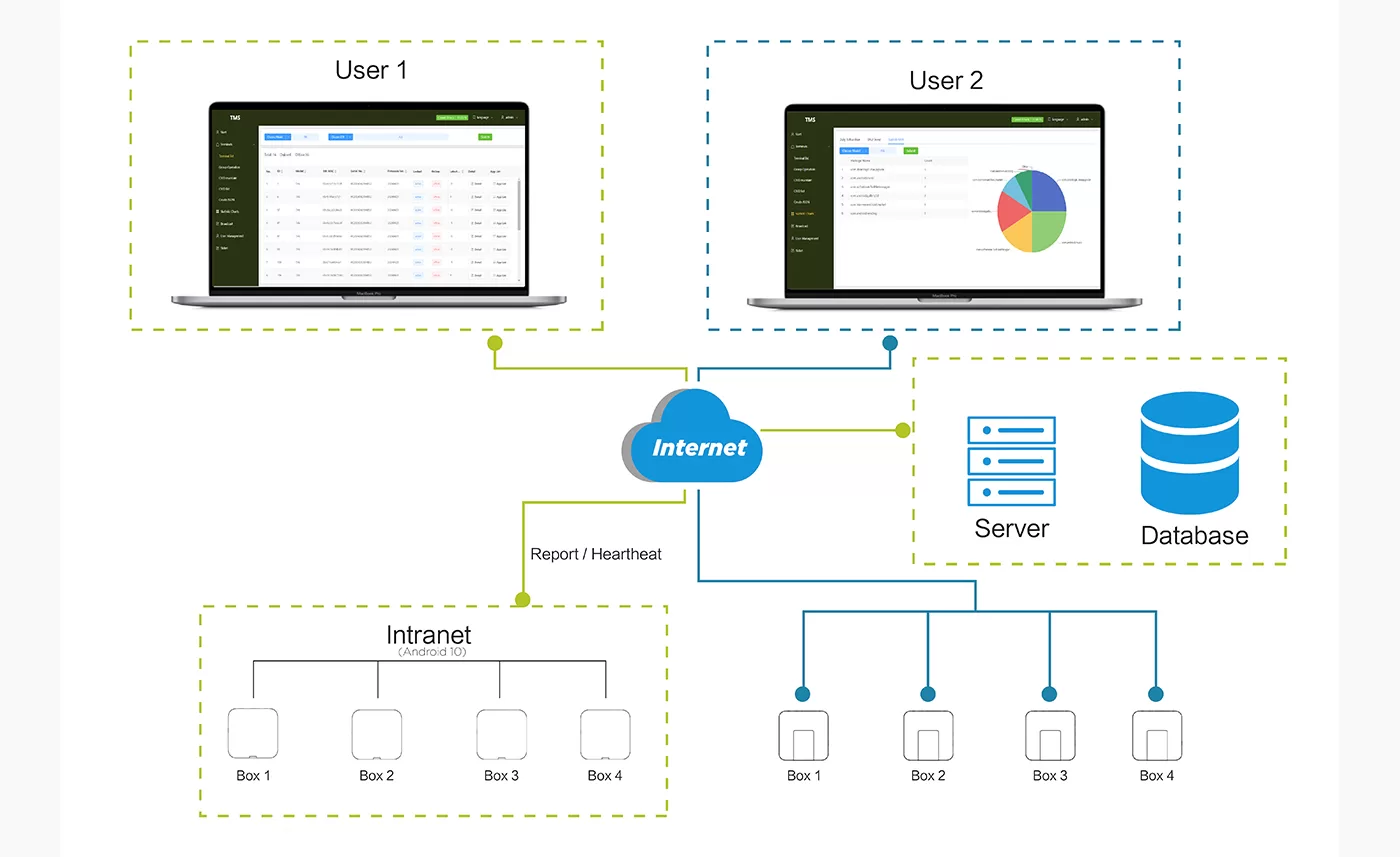 Our Android TV Box Terminal Management System (TMS) allows seamless monitoring, control, and management of multiple Android TV boxes across various locations through a centralized web-based interface. The system operates by connecting all components over the Internet, enabling real-time communication between users, servers, and TV boxes.